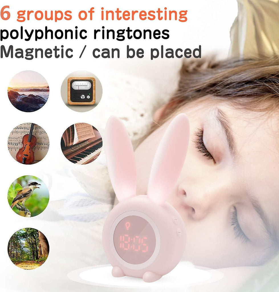 describe: [Scheduled night light and night light with sleep function]: Timed night light 30 minutes/60 minutes, afraid of the dark at night, you can set the night light to sleep adjust, the breathing light is like breathing, soft and gentle, does not affect sleep and saves energy. [Digital display and countdown timer]: time, date, alarm and temperature ( Celsius) are clearly displayed on the screen through the digital tube. Press the hour button to display the date. Countdown function from 1 to 59 minutes, 3 o'clock and dazzling long-term reminders to avoid forgetting, leaving food in the microwave for days or forgetting to turn off the flame. [Morning light function]: Set the alarm clock from noon to 8am. 10 minutes before the alarm clock, the light turns on slowly, allowing you to wake up naturally. It doesn't matter if the alarm clock has two alarm clocks. [6 funny and cool ringtones]: Alarm clock setting R1, R2, 6 ringtones are no longer monotonous, you can use the Adjust ringtone volume and turn off the key tone, learn how to live and take care of your family. [Practical] - Cute rabbit shape, cute night light can be used as Christmas gifts, birthday gifts, funny and Practical gifts for children or yourself. Office, dining room next to the bed or elsewhere.