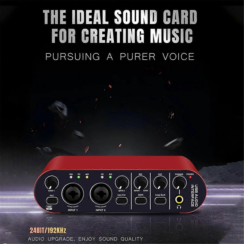 THE IDEAL SOUND CARD FOR CREATING MUSIC - Pursuing a purer voice. MULTIPLE CORE FUNCTIONS - Help you create high-quality music. NO DRIVER INSTALLATION REQUIRED TO USE - Compatible with computer usage give a Recording Room Effects. CHIP - Good audio quality Comes From a good core. EXCELLENT SAMPLING RATE - 24 BIT/192KHZ sampling rate For clearer Auditory Effects reject sound distortion. HD MICROPHONE INPUT - ELIMINATING NOISE AND GIVING YOU A CLEAN SOUND SPACE. SOUND CARD DESIGNED FOR SINGER-SONGWRITER - PROVIDE FOUR MAJOR ADVANTAGES IN SINGING, PERFORMANCE, AND MUSIC RECORDING. HIGH DYNAMIC INPUT - GUITAR AND OTHER INST ENTS INPUT WITHOUT WORRYING ABOUT OVERLOAD OR DISTORTION. REAL TIME MONITORING OF EAR RETURN - THE SOUND CARD IS EQUIPPED WITH A 6.35/3.5MM MONITORING OUTPUT INTERFACE. Colour:Red Material:Metal Package Contents: 1 * Audio Interface 1 * Cable 1 * English instruction manual Only the above package content, other products are not included. Note: Light reflection and different displays may cause the color of the item in the picture a little different from the real thing. The measurement allowed error is +/- 1-3cm.