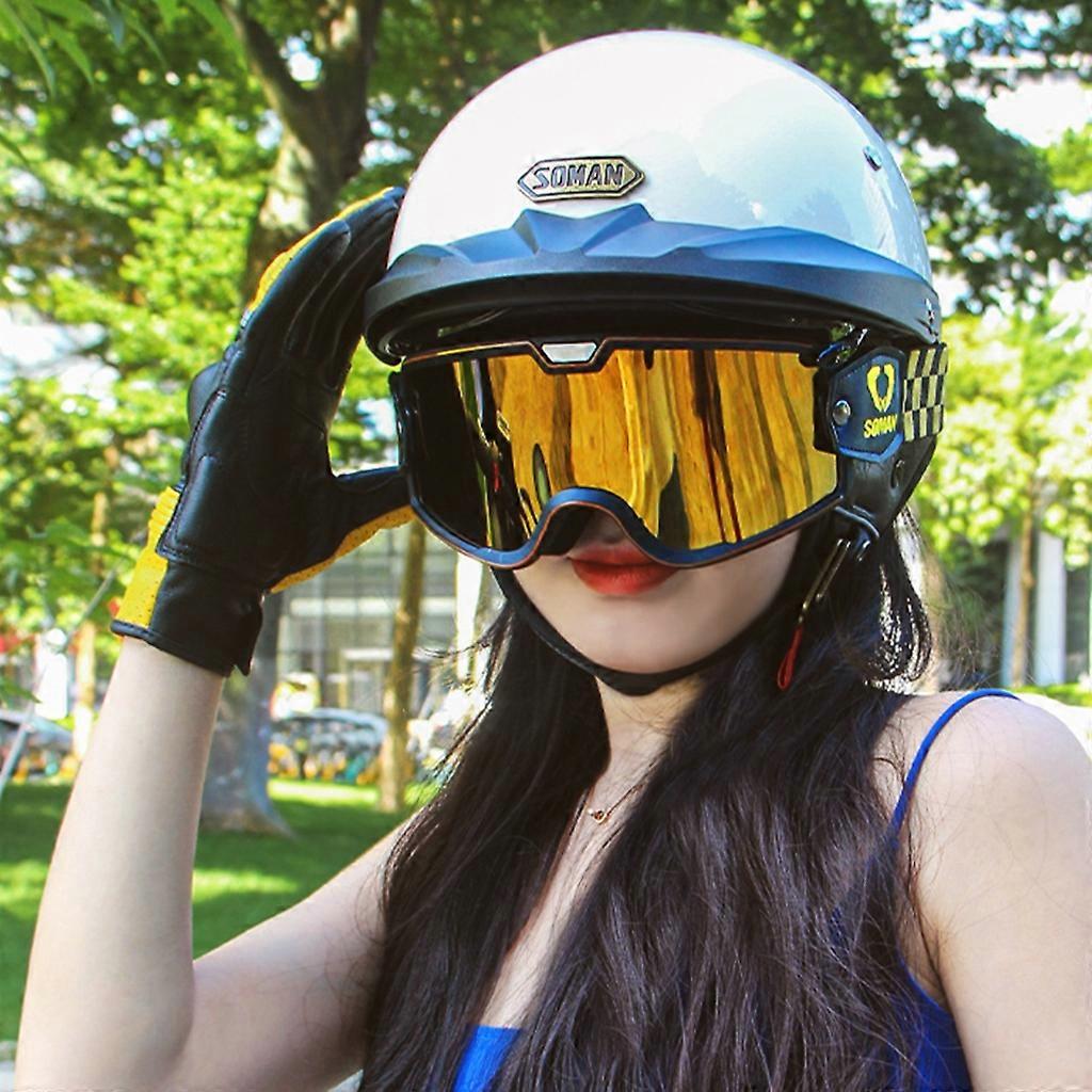Features: High strength ABS-shell, lightweight and impact resistance. Sleek-and lightweight design reduces wind noise. Multi-density EPS-safety buffer layer-offers state-of-the-art energy absorption. Comfort soft padding liner uses breathable technical fabric, high-grade fabric, soft, absorbent, ventilation, better flexibility; more cleanliness. The glasses design, provide UV-protection. Quick release buckle for a secure fit that will stay on your-head. Removeable ear protector. Reasonable design: Give your ride a lot of fun. Specifications: Material:ABS Size:As Picture Shown Note: .Please allow 1-2cm errors due to manual measurement, make sure that you do not mind before you order. .Due to the difference between different monitors, the picture may not reflect the actual color of the item. Thanks for your understandings. Package includes: 1x Motorbike Helmet