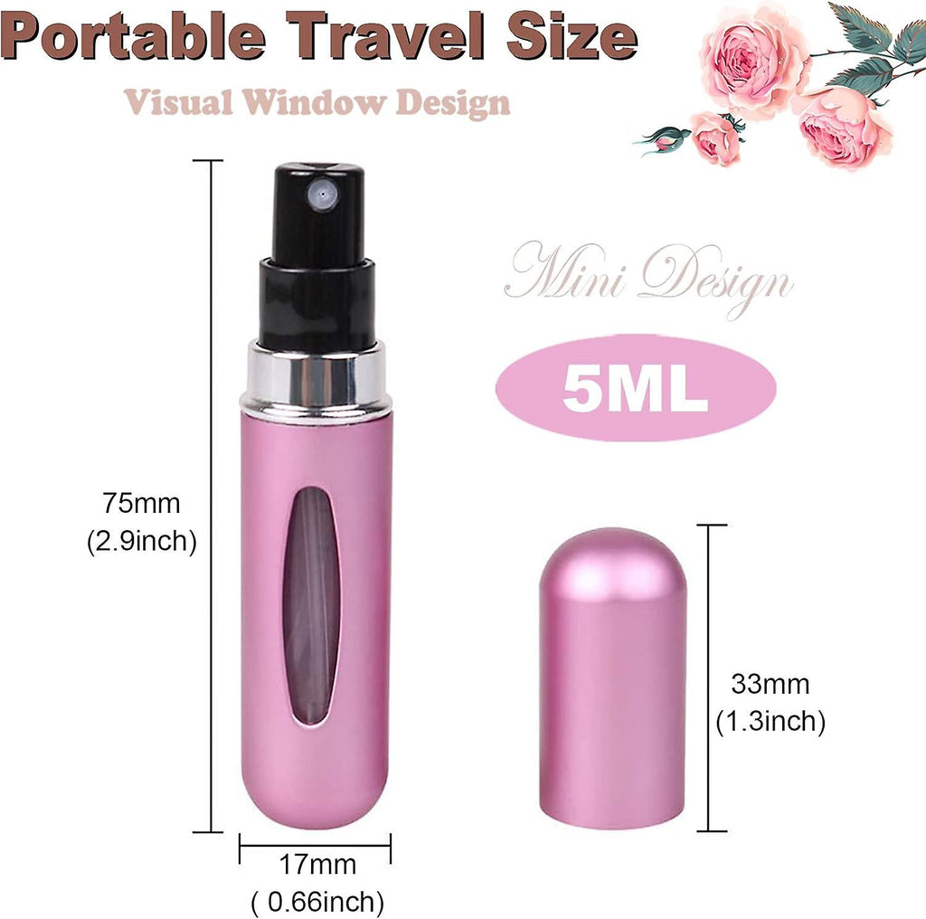 [Visual design and capacity] 5ml/piece, various colors, transparent window to clearly see the perfume residue inside [Repeatable filling] Our fragrance sprayer is the perfect solution for transporting your favorite spices, essential oils and aftershaves. Take them to a party, on vacation, leave them in the car, go to dinner with friends, the gym or wherever you need them to keep them looking and smelling great. Fine spray, even coverage [Travel Mini Size] The perfume spray bottle measures approx. 8 x 1.6 x 1.6 cm (3.1 x 0.6 x 0. 6 inches) and offers over 70 sprays. Thanks to the lightweight and durable aluminum material, it fits perfectly in your handbag or pocket [Premium No Leakage] The bottle atomizer body is made of high quality aluminum, the interior is made of sturdy glass, it will not break , if dropped, it is durable and will not leak. [Easy to open for convenience] This perfume spray bottle is easy to fill and refill without leaking. Just press the bottom of your favorite perfumer and keep clicking until it's full