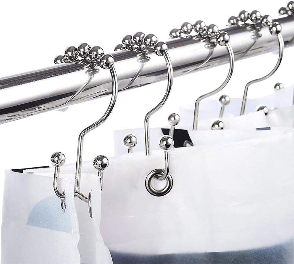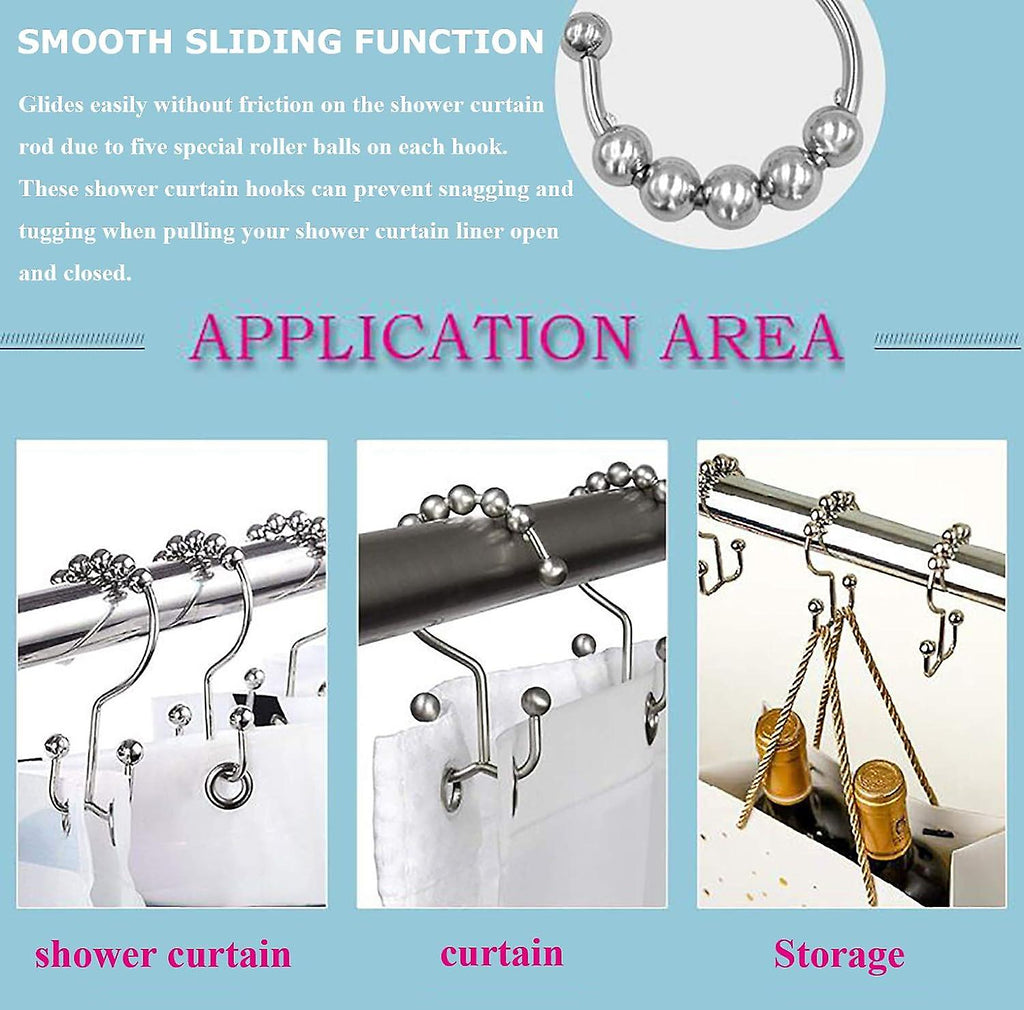 describe: EASY TO USE: With these shower curtain rings you can easily hang or remove shower curtains and liners. Installation only takes a few minutes and the unique design prevents them from falling out. The shower curtain rod with hook roller and ball glides smoothly and quickly on the shower rod. Double hook design: The double bearing sliding shower curtain hooks are strong enough to hold shower curtains and bathroom liners. Double sliding shower curtain hooks allow you to hang shower curtains and shower liners separately. HIGH-QUALITY METAL: Made of durable, sturdy and long-lasting metal material, it holds sturdy curtains and liners perfectly. These shower curtain hooks are made of high quality metal material and have anti-rust coating. They are durable and long lasting. Smooth sliding function: There are five special rollers on each hook that allow the shower curtain rod to slide easily without rubbing the shower rod. These shower curtain hooks prevent snagging and opening and closing of the shower curtain liners. SET OF 12: These double shower curtain hooks are sold in a set of 12 shower curtain rings. Most of the quantitative needs of ordinary bathrooms are met. Fits all standard size shower curtain rods.