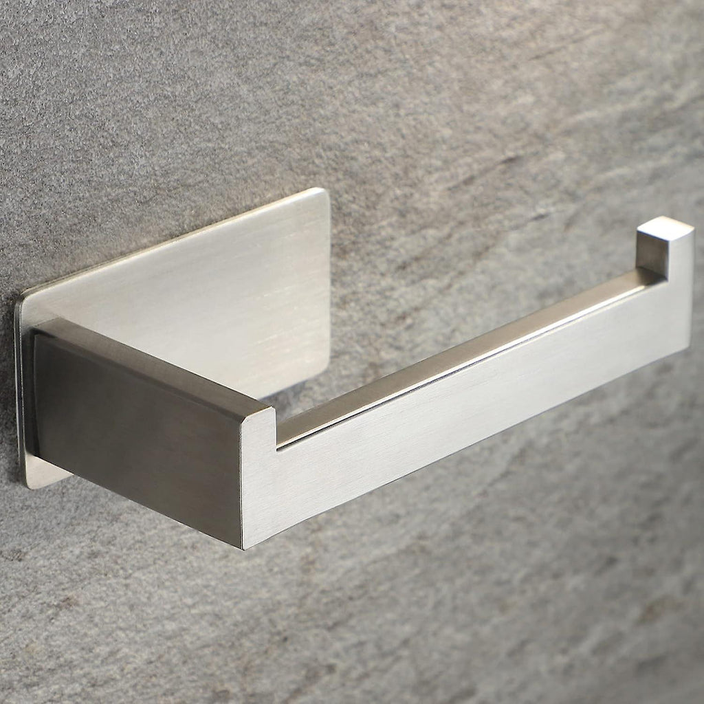 [High-quality material]: Stainless steel, waterproof, rust-proof, scratch-resistant; Brushed surface, modern and anti-fingerprint, easy to clean. [1 minute installation]: self-adhesive toilet paper holder, quick and easy installation, tear off the cushion, stick on a smooth, dry wall, wait 24 hours to install to hang the tissue. [Non-slip design]: The end of the toilet paper holder is raised, which perfectly protects the paper towels on the rod and makes it easier to pull out the paper rolls. [Geometric beauty]: Just the right lines, modern and elegant, ideal for bathroom, toilet, kitchen, providing the perfect solution for decorating your home.