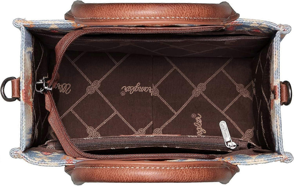 1.A subtle but elegant tote bag for women Wrangler by. 2.Wrangler canvas shoulder purses have a different feel and a different flair. 3.We designed an Aztec style around this tote bag. Guitar strap brings a unique and cool woman with your wrangler jeans. 4.Wrangler Purse with top zipper closure, inside zippered compartments, has 2 open pockets and 2 zippered pockets.