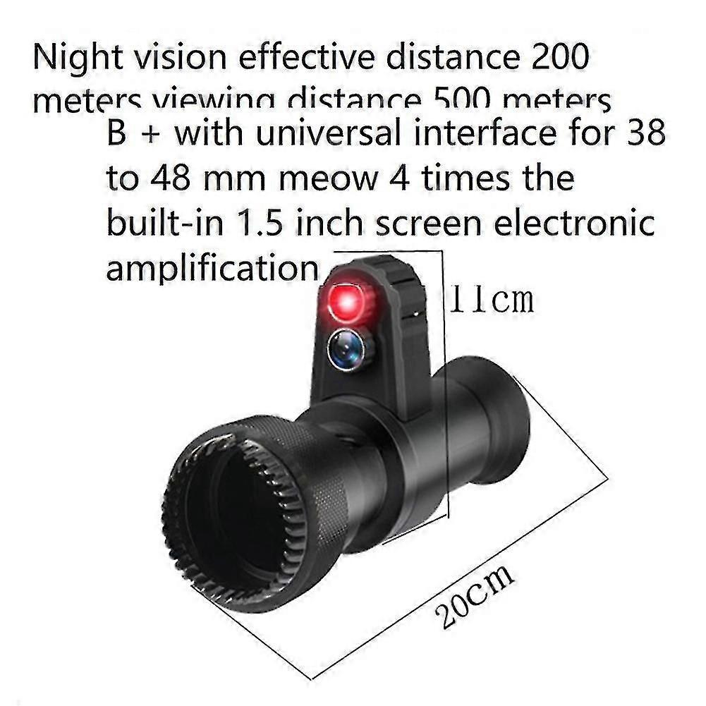 More Portable Design:This night-visions device is designed to be suitable for the shape of take-out, it is convenient for your daily out and carry. This night-visions device has the crossing cursor system for better and quick aim, giving you a better experience. The effective distance of all-black night-visions is 200-300 , and the visual distance is 500 . Wide Applications: This tool can be widely used for night outdoor animal observation, animal tracking, fishing watching and so on. Built-in capacity lithium battery to supplys power, so you can recharge it . You can use this night-visions device during the day or night to help you see distant objects. with interface suitable for 38-48mm diameter sight. : Metal + Plastic colour: black Package Contents: 1 x Digital Night-Visions Only the above package content, other products are not included. Note: Light reflection and different displays may cause the color of the item in the a little different from the real thing. The measurement allowed error is +/- 1-3cm.